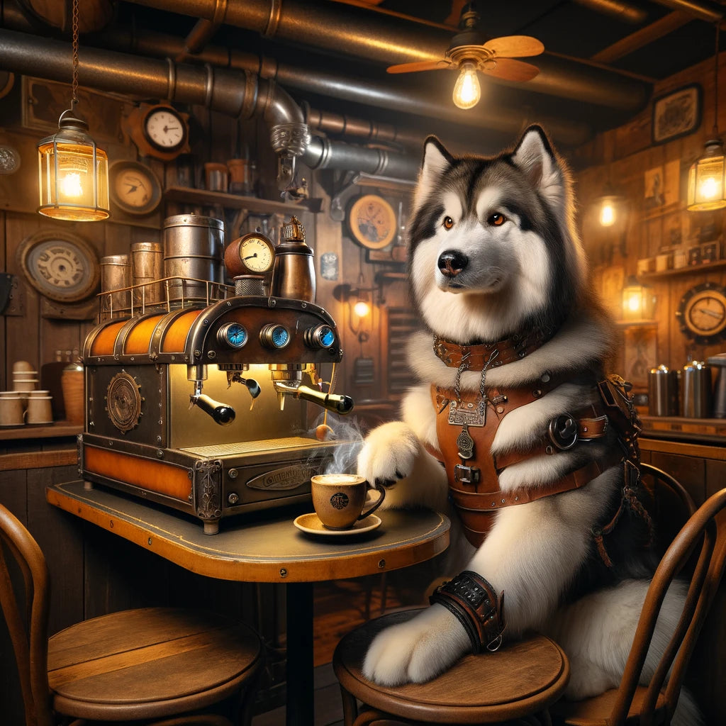 Hector is the embodiment of steampunk sophistication and canine charisma. As the proprietor of "The Gear and Growl," a renowned coffee shop nestled in the heart of the cobblestone-clad city, he's as skilled with an espresso machine as he is with a wrench. Hector's a master barista, his fur as sleek as the steam that dances from the cups of coffee he artfully crafts.