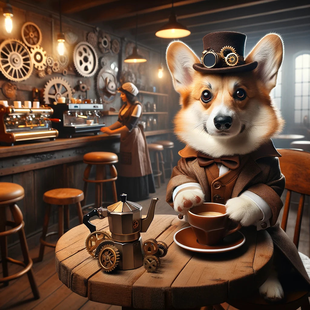 Bruno, a charming corgi with a flair for the refined, runs the bustling "Paws & Pots" café in the heart of the old steam district. Distinguished by his top hat and tailored coat, Bruno has a keen eye for detail and a taste for the finest brews.