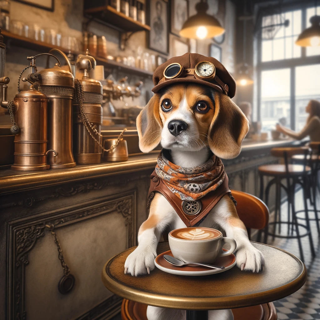 Rimshot, the beagle with an eye for vintage, is the dapper owner of "The Timeless Brew," a coffee sanctuary where the past and present fuse. With his leather aviator cap and steampunk accessories, he brings an air of yesteryear's charm to the modern café scene.